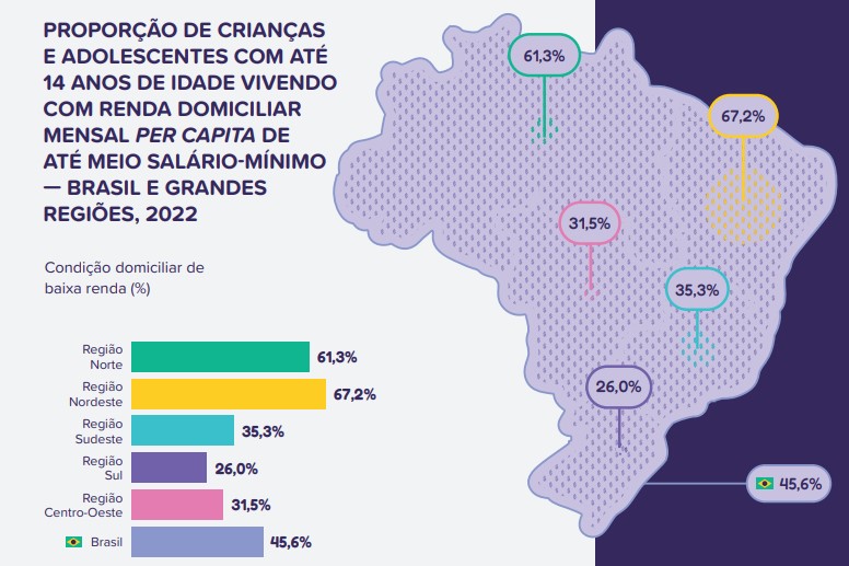 Entre os dados disponibilizados que chamam a atenção está a questão da pobreza. No Brasil, quase 46% das crianças e adolescentes com até 14 anos de idade vivem em domicÃlios cuja renda per capita mensal é de até meio salário mÃnimo, conforma mostra o gráfico abaixo.